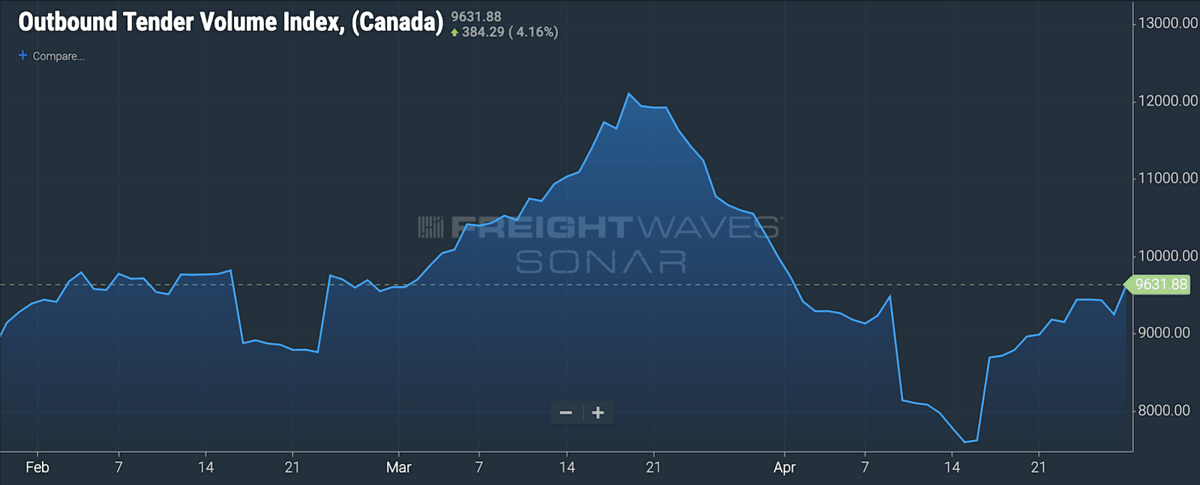 L’indice du volume des appels d’offres sortants – Canada (OTVI.CAN) sur la plateforme SONAR de FreightWaves est en hausse de 27 % par rapport à son niveau le plus bas d’avril.