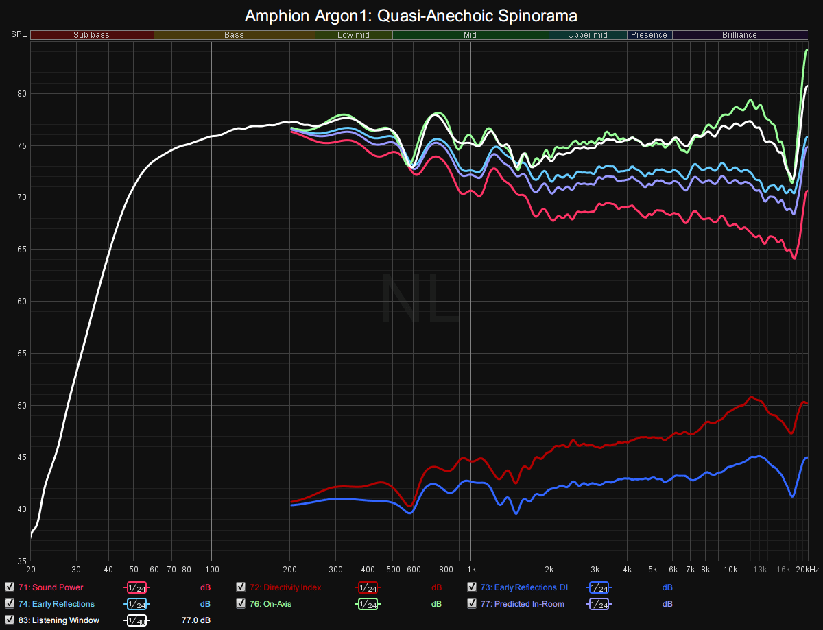 Comme pour la plupart de mes critiques de haut-parleurs, j’ai effectué une vaste série de mesures pour capturer les caractéristiques de réponse en fréquence et de directivité de l’Argon1. Des décennies de recherche ont montré que ces paramètres sont les plus importants pour caractériser le son d’un haut-parleur. La directivité, comme sous-entendu précédemment, est particulièrement cruciale; de nos jours, il est facile de fixer le son direct avec un égaliseur, mais la directivité ne peut pas être modifiée.