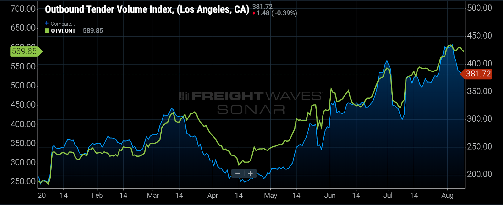 Le rail étant congestionné, de nombreuses entreprises cherchent à acheminer les importations par camion. Pour cette raison, selon l’indice du volume des appels d’offres sortants, les volumes de camions en provenance de Californie ont également atteint des niveaux records.