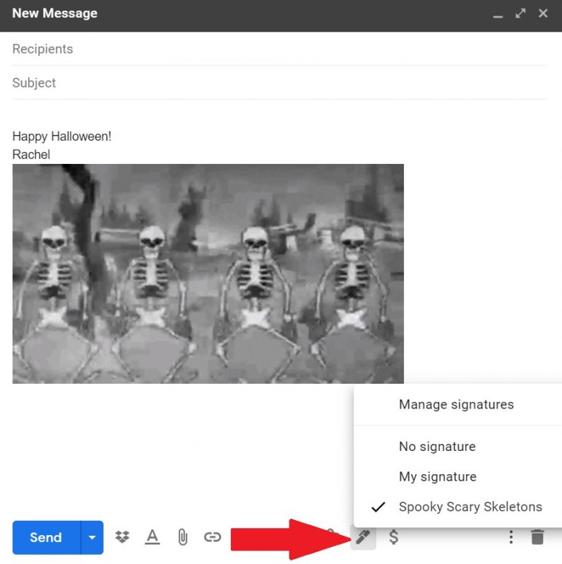 Tout d’abord, vous devez créer des signatures multiples. Pour ce faire, allez dans votre menu « Paramètres » et cherchez-le sous l’onglet « Général ». Vous devrez peut-être faire défiler les pages pendant un certain temps, mais vous arriverez finalement à la section « Signatures ». Si vous avez déjà une signature, celle-ci sera répertoriée sous « Ma signature ». Cliquez sur « Créer un nouveau » pour en faire un deuxième. Voici que je fais une signature préemptive sur le thème d’Halloween :