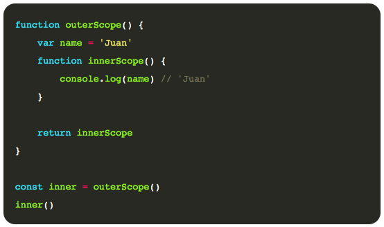 Quand outerScope()est appelé, il renvoie une référence au innerScope function, qui est appelée ultérieurement à partir de la portée la plus externe. Lorsque vous lisez ce code pour la première fois, vous ne savez peut-être pas pourquoi innerScope aurait console.log la valeur Juan comme nous l’appelons à partir de la portée globale, ou portée du module, où name n’est pas déclaré.