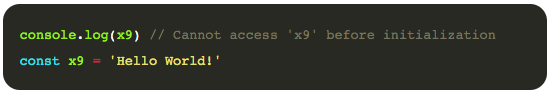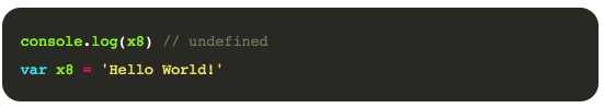 Le fait que la variable soit « créée » avant sa définition réelle dans le code ne signifie pas que sa valeur est déjà affectée, c’est pourquoi lorsque nous faisons le console.log(x8) nous n’obtenons pas d’erreur indiquant que la variable n’est pas déclarée, mais que la variable a une valeur undefined. Très intéressant, mais que se passe-t-il si nous utilisons let ou const? Souvenez-vous que dans notre tableau, ils ne partagent pas cette propriété.
