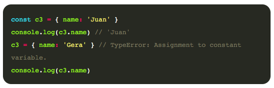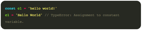 Cette rubrique couvre spécifiquement les variables déclarées avec le mot-clé const. Une variable déclarée avec const ne peut pas être réaffecté, ce qui signifie que nous ne pouvons pas changer sa valeur pour une nouvelle, mais il y a une astuce. Voyons quelques exemples: