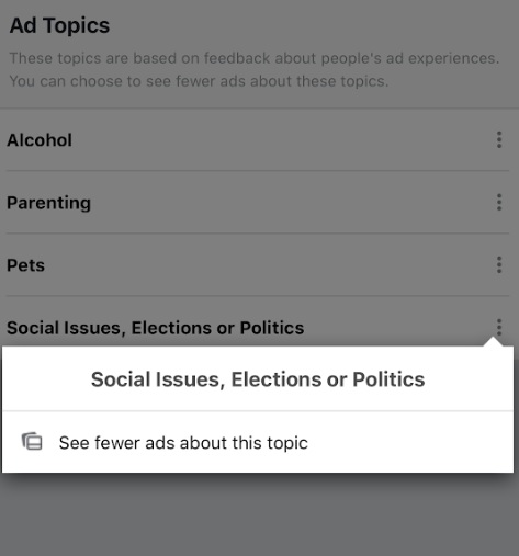 Sélectionnez les points de suspension à côté de « Questions sociales, élections ou politique ». Vous verrez l’option « Afficher moins d’annonces sur ce sujet ». Touchez ceci. Bien que cela n’éliminera probablement pas complètement les publicités politiques de votre flux (Facebook ne garantit pas que ce sera le cas, d’où l’utilisation du mot « moins »), cela vous aidera à réduire ce que vous voyez.