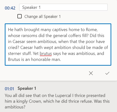 Notez qu’il a réussi à obtenir le monologue entier plus ou moins correct, avec des majuscules et des ponctuations bancales. Pour modifier chaque section, cliquez sur l’icône en forme de crayon à côté. Vous pouvez corriger la ponctuation ou des mots individuels que la transcription a peut-être manqués. Je ne sais pas si le logiciel de transcription a été formé sur Shakespeare ou non, mais j’ai été impressionné par le fait qu’il ait réussi à obtenir «Lupercal» correctement.