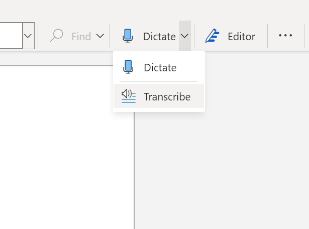Tout d’abord, vous devez accéder à la version en ligne de Word, à laquelle vous pouvez accéder à partir du site Office. Ensuite, ouvrez un nouveau document ou celui auquel vous souhaitez ajouter une transcription. Vous verrez une option de microphone dans le ruban d’outils en haut de l’écran, avec le mot « Dicter » en dessous. Cliquez sur la flèche à côté, et l’option «Transcrire» devrait apparaître dans le menu déroulant.