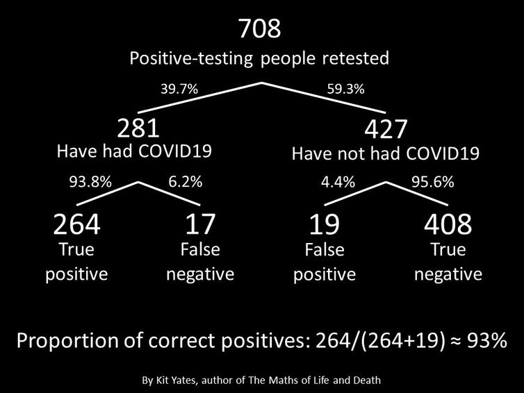 La précision des tests est peut-être la moins bien comprise des préoccupations. La Food and Drug Administration (FDA) américaine a accordé une autorisation d’utilisation d’urgence à sept fabricants pour la mise sur le marché de tests d’anticorps pour COVID-19. L’un des premiers tests à obtenir une autorisation a été développé par Cellex. Si vous avez des anticorps contre COVID-19, leur test vous le dira correctement dans 93,8 % des cas (c’est la « sensibilité » du test). Si vous n’en avez pas, il vous le dira correctement 95,6 % du temps (c’est la « spécificité » du test). Obtenir le bon résultat plus de 90 % du temps semble assez encourageant.