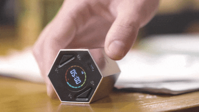 L’appareil a la forme d’un long hexagone, et chaque côté correspond à une minuterie différente : 3, 5, 10, 15, 25 ou 30 minutes. Posez la minuterie de manière à ce que votre réglage préféré soit orienté vers le haut, et la minuterie démarre automatiquement – elle fonctionne instantanémentLes écrans tactiles et les boutons ne sont pas nécessaires. Si vous souhaitez configurer une minuterie personnalisée, un écran et deux boutons de réglage se trouvent à une extrémité de l’appareil. Lorsque l’alarme se déclenche, il suffit de faire pivoter l’appareil pour qu’il s’éteigne.