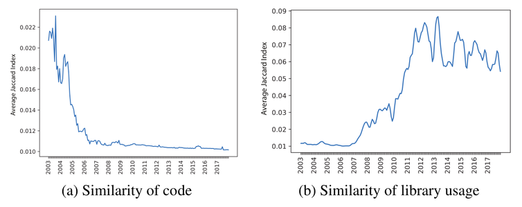 Vous pourriez penser que ces sites ne font que copier le code de l’autre, mais la similarité des codes a en fait considérablement diminué au fil du temps. En revanche, l’utilisation des bibliothèques de logiciels a beaucoup augmenté.