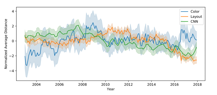 Nous avons constaté que pour les trois mesures – couleur, mise en page et attributs générés par l’IA – les différences moyennes entre les sites web ont atteint un sommet entre 2008 et 2010, puis ont diminué entre 2010 et 2016. Les différences de mise en page sont celles qui ont le plus diminué, avec une baisse de plus de 30 % sur cette période.