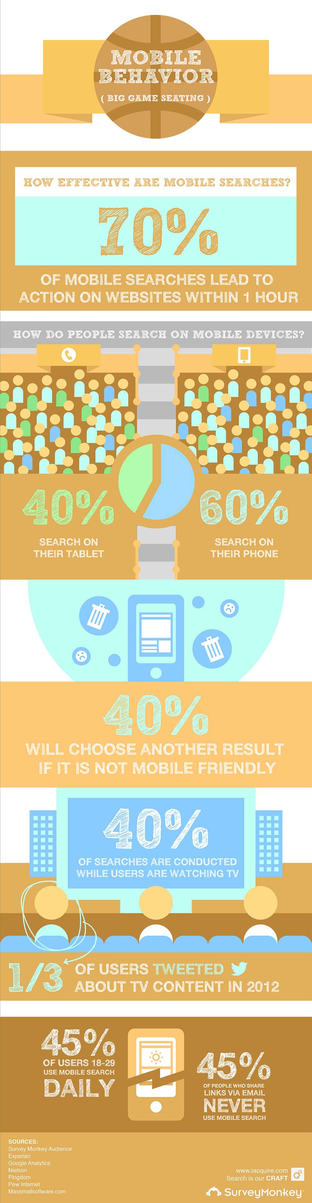 Au delà de ces deux tendances majeurs directement liées à l’essor considérable du mobile, on remarque que les recherches ne sont pas non plus en reste. Alors qu’on estime que les recherches effectuées sur mobile représentent 20% du total des recherches, l’infographie ci-dessous montre qu’elles sont particulièrement génératrices de leads, que ce soit des commandes, des demandes de devis, des prises de contact ou encore de souscriptions à des services de nature variée. 70% d’entre elles convertiraient effectivement dans un délai d’une heure. Autre statistique notable : 40% des mobinautes choisiraient un autre résultat si celui qu’ils sont en train de visiter n’est pas adapté à leur appareil. Une occasion de préciser que 60% des recherches sur mobile sont effectuées depuis un smartphone et les 40% restant depuis une tablette.