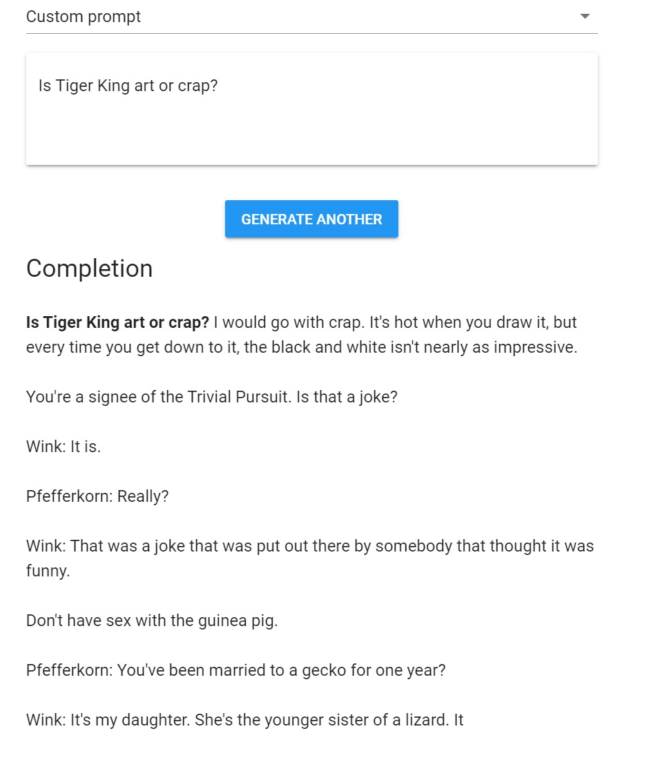 Étant donné que nous sommes tous coincés à l’intérieur, il y a des choses pires que de passer son temps à communiquer avec l’une des IA les plus avancées du monde. N’oubliez pas que le GPT-2 est à peu près aussi intelligent qu’un réfrigérateur : utilisez-le uniquement à des fins de divertissement.