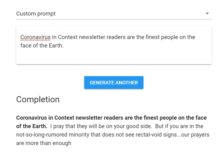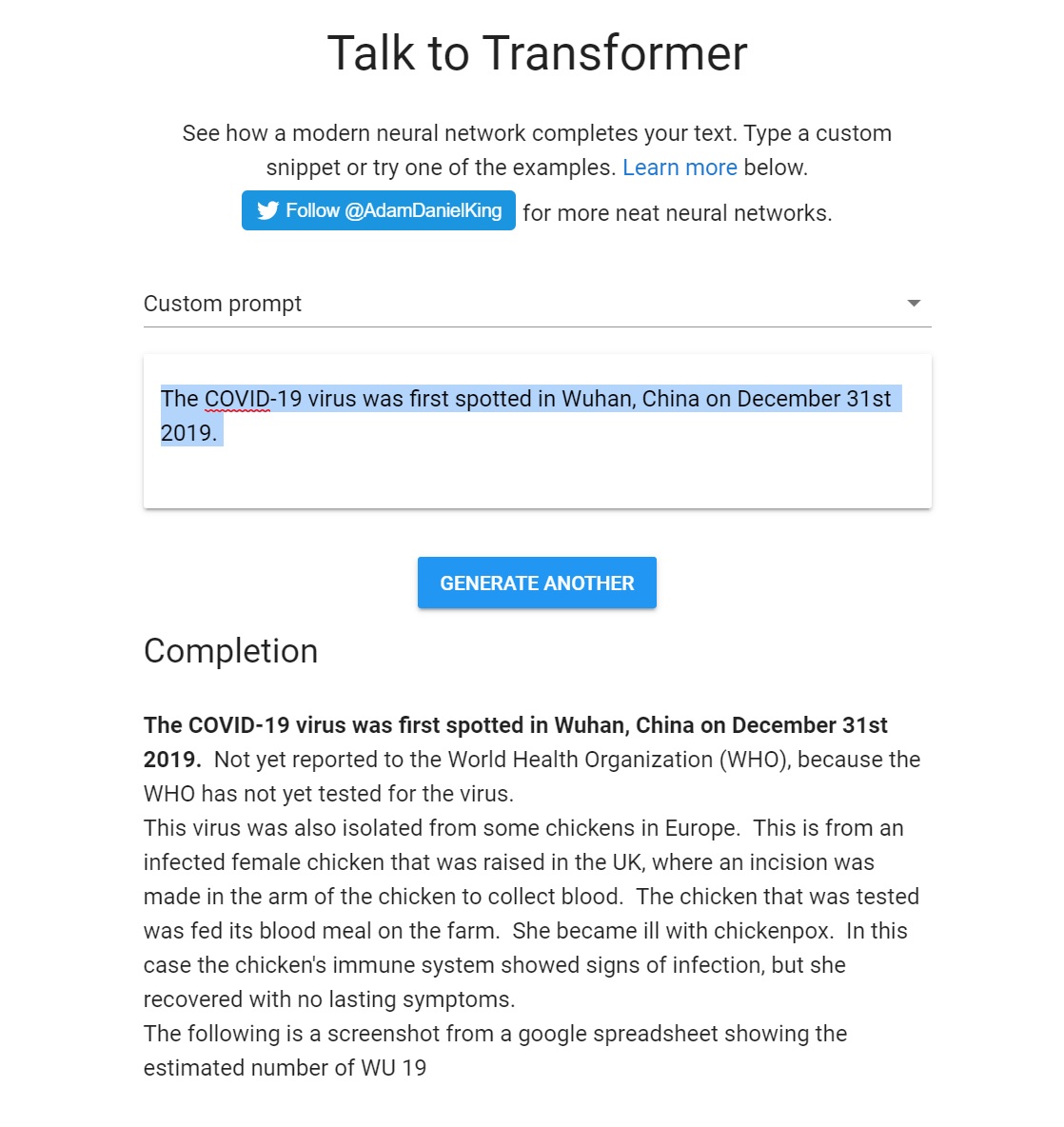 Comme vous pouvez le voir, COVID-19 est le résultat de poulets qui ont contracté la varicelle après avoir mangé un « repas de sang » à la ferme. Bien sûr, c’est du charabia (l’IA ne sait pas de quoi elle parle), mais c’est vraiment très amusant.