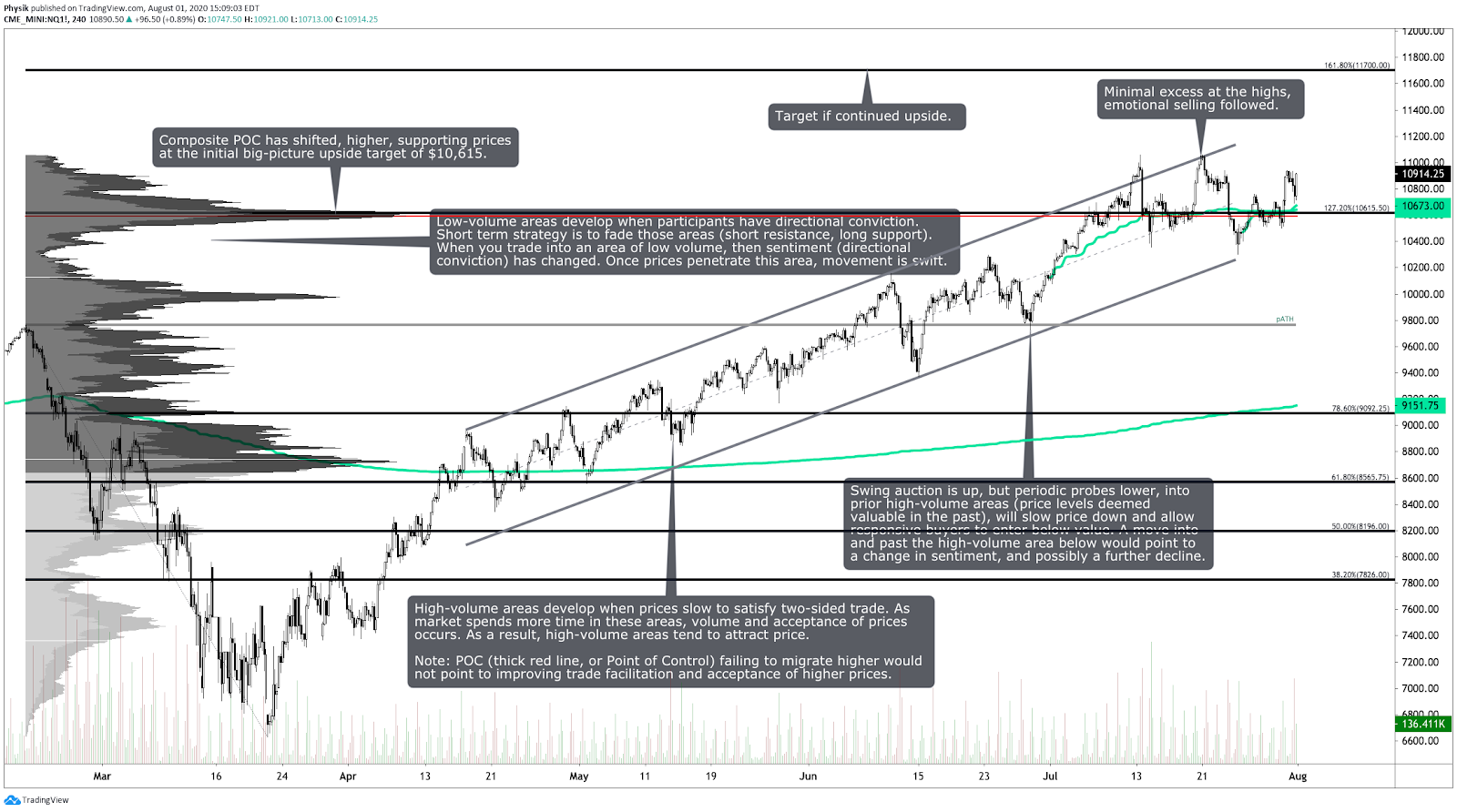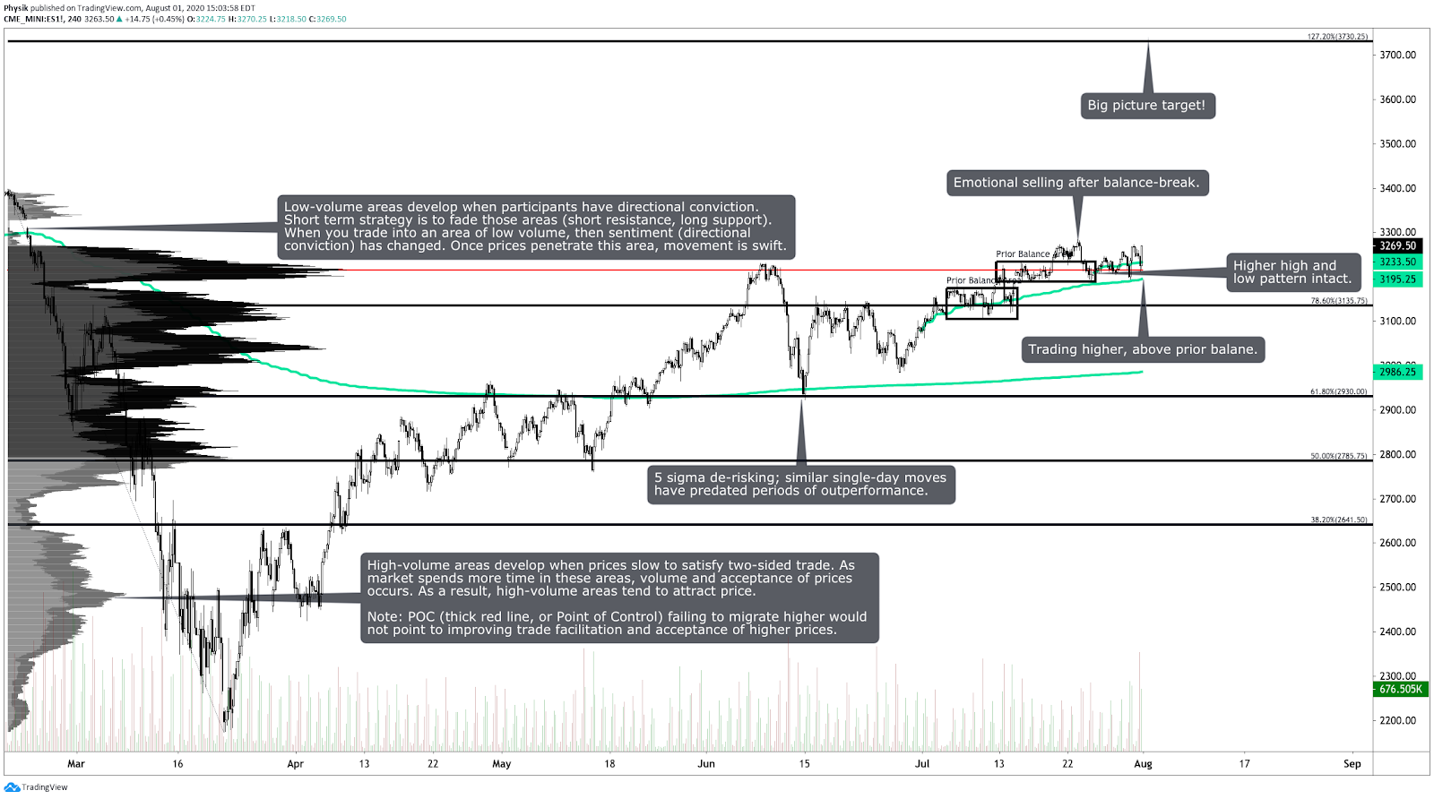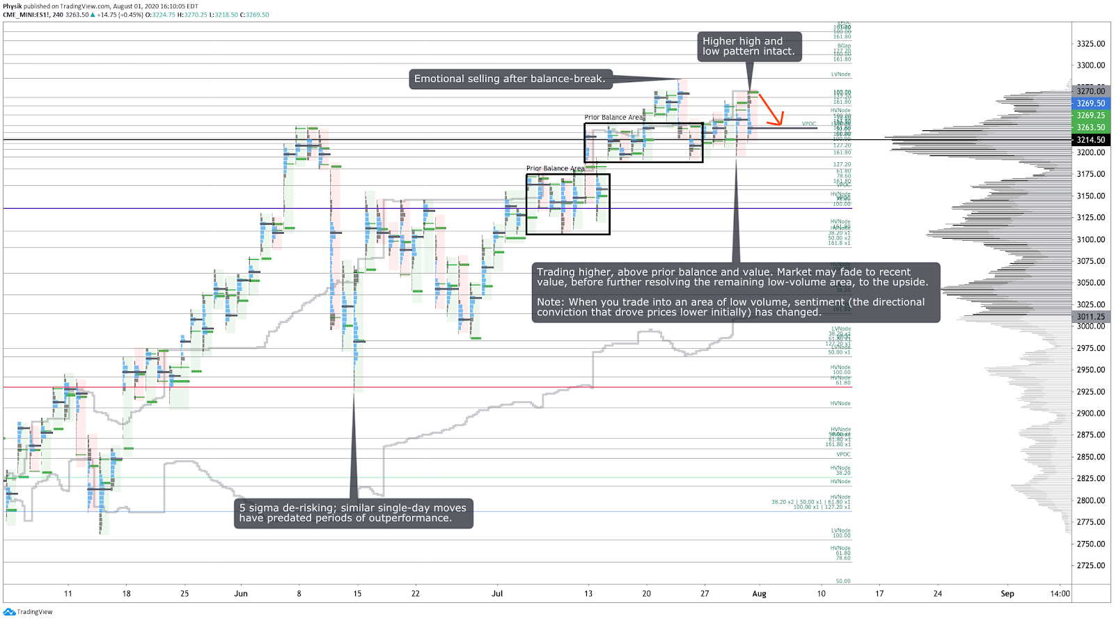 Mardi, le S&P 500 a tenté de ronger la structure médiocre laissée par la vente du 23 juillet, avant d’allouer à la sécurité sur des résultats trimestriels décevants lors de la session européenne. Pour le reste de la session américaine, le S&P s’est négocié de manière réactive et a baissé, avec delta, jusqu’à la clôture alors que les données fondamentales américaines se sont affaiblies. Les acheteurs à moyen terme sont restés aux commandes mercredi alors que le S&P marchait beaucoup plus haut, bien que sur une structure et une participation médiocres, la Réserve fédérale ayant réitéré son engagement à soutenir l’économie et des mises à jour positives des résultats.