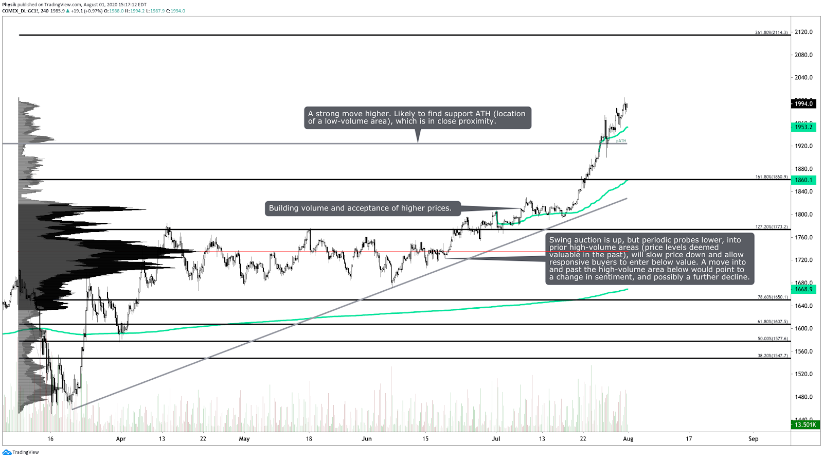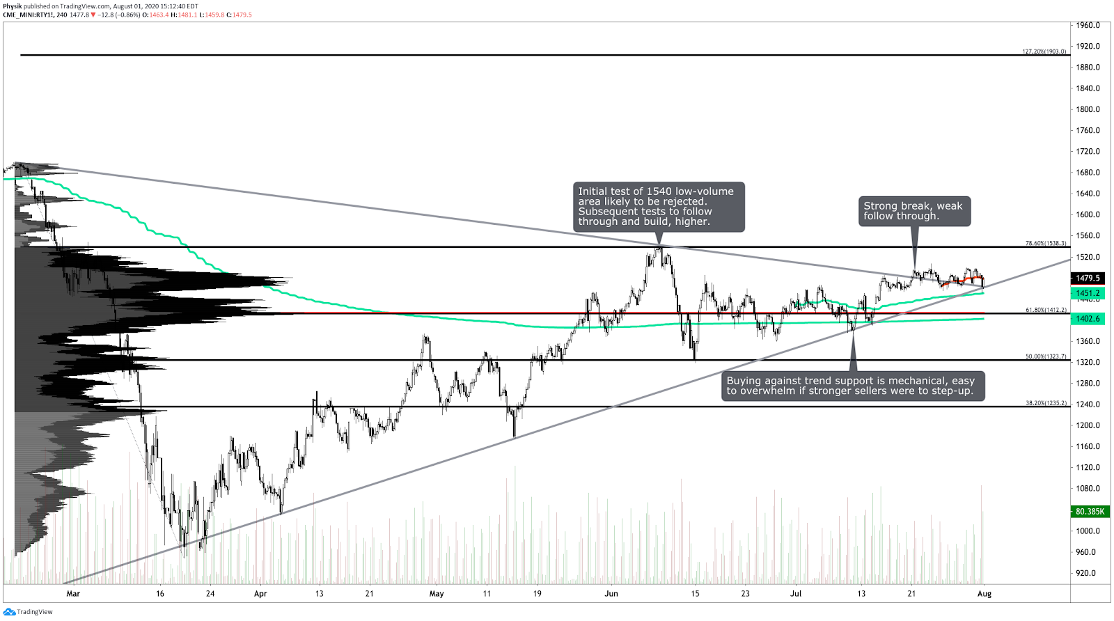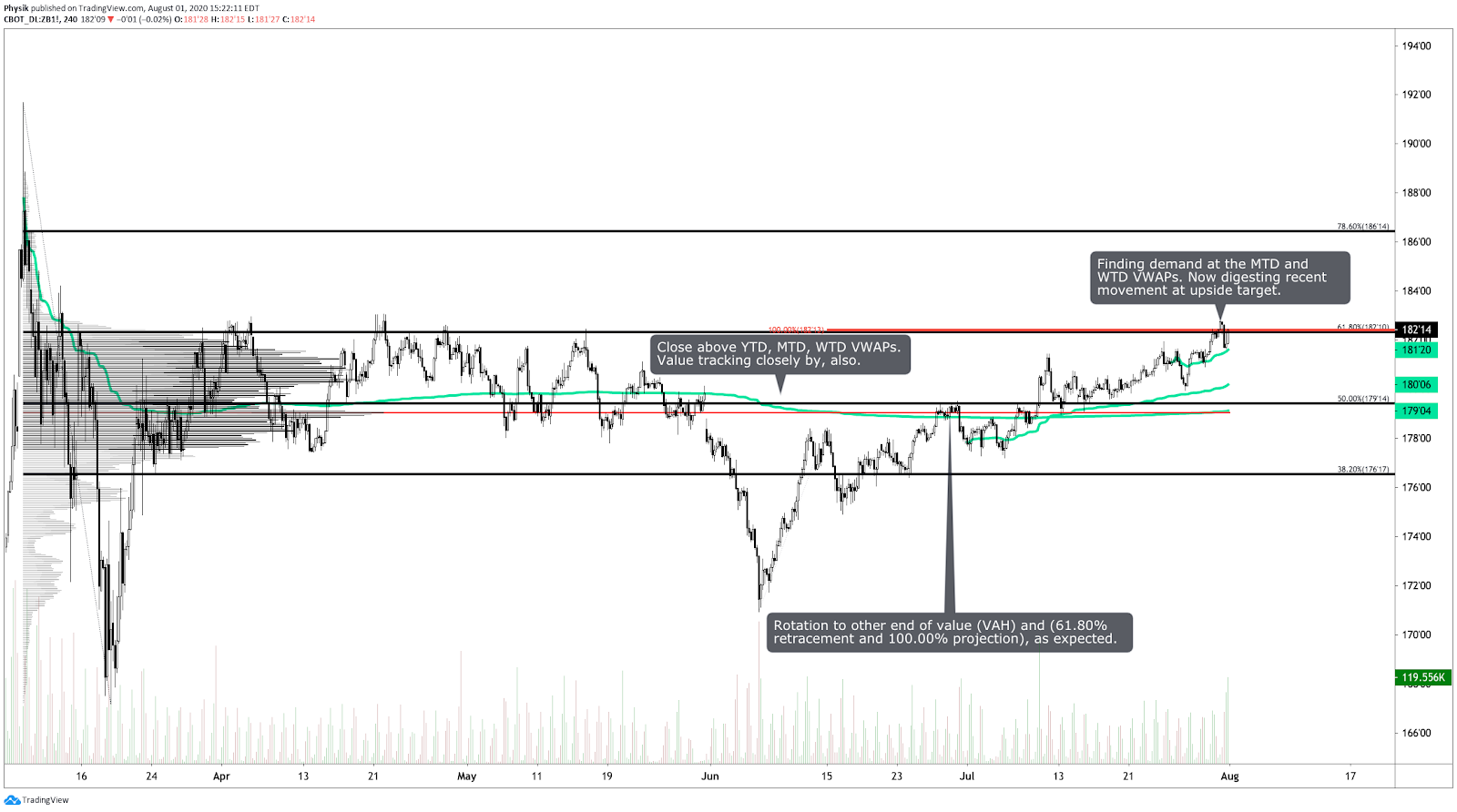 Mardi, le S&P 500 a tenté de ronger la structure médiocre laissée par la vente du 23 juillet, avant d’allouer à la sécurité sur des résultats trimestriels décevants lors de la session européenne. Pour le reste de la session américaine, le S&P s’est négocié de manière réactive et a baissé, avec delta, jusqu’à la clôture alors que les données fondamentales américaines se sont affaiblies. Les acheteurs à moyen terme sont restés aux commandes mercredi alors que le S&P marchait beaucoup plus haut, bien que sur une structure et une participation médiocres, la Réserve fédérale ayant réitéré son engagement à soutenir l’économie et des mises à jour positives des résultats.