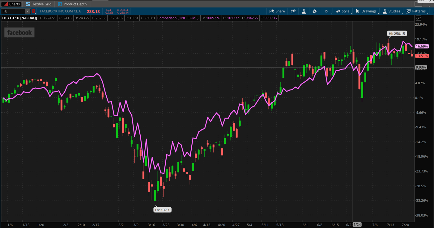 FIGURE 1: BEAUCOUP À «AIMEZ». Les partages Facebook (chandelier) suivent de près le rythme de l’ensemble Nasdaq (COMP – ligne violette) pour la majeure partie de 2020, bien qu’ils aient légèrement pris du retard ces derniers temps, les inquiétudes liées à la publicité suscitant des inquiétudes. Source des données: Nasdaq. Source du graphique: la plateforme thinkorswim® de TD Ameritrade. À titre indicatif seulement. Les performances passées ne garantissent pas les résultats futurs.